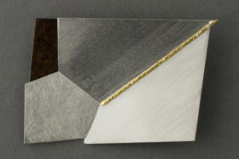 Halssieraad, ook als broche te dragen, roestig ijzer met fijngoud en zilveren ketting